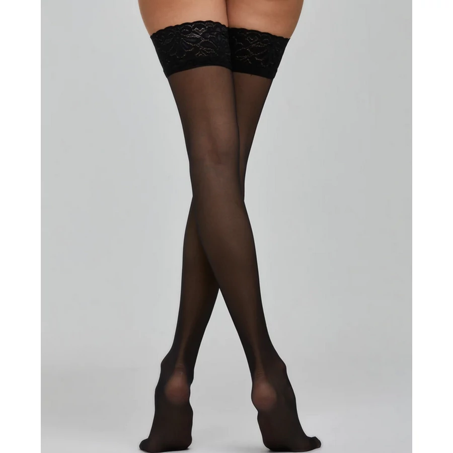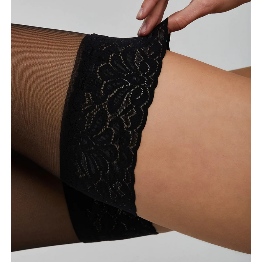 20 denes, selyemfényű, szilikonos, elasztikus combfix, 8 cm széles csipkével.