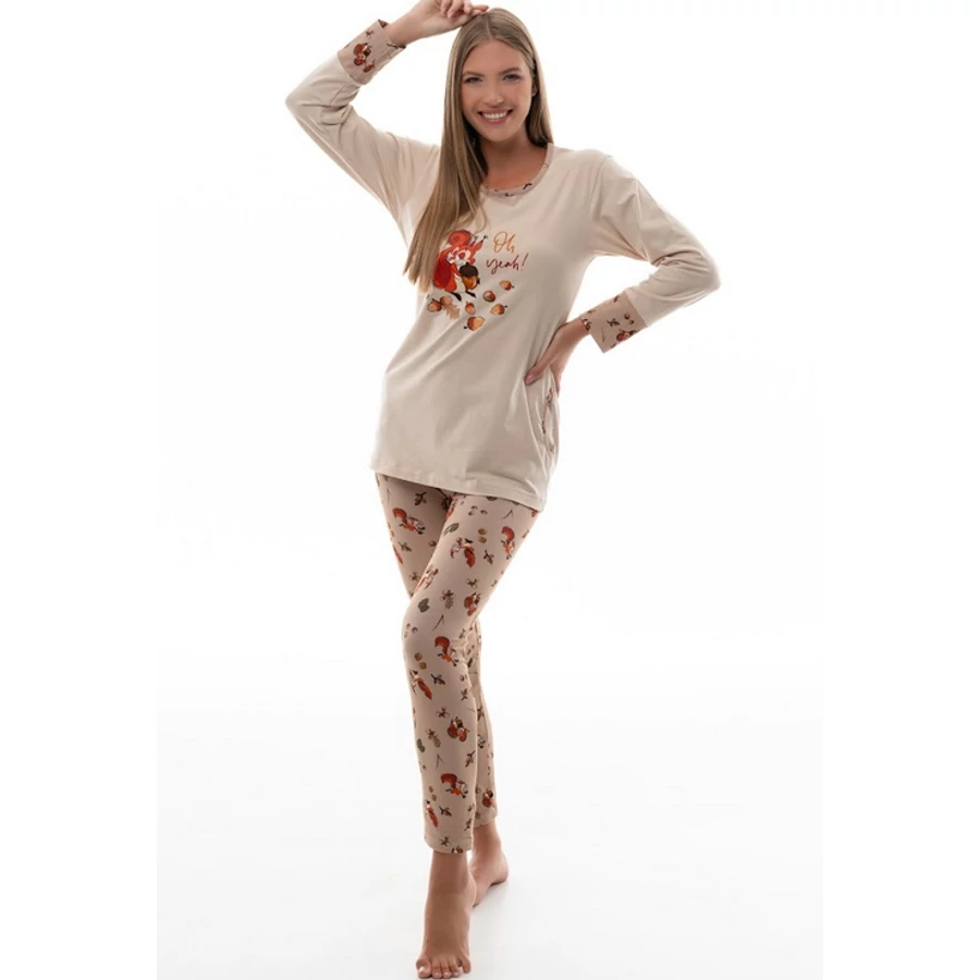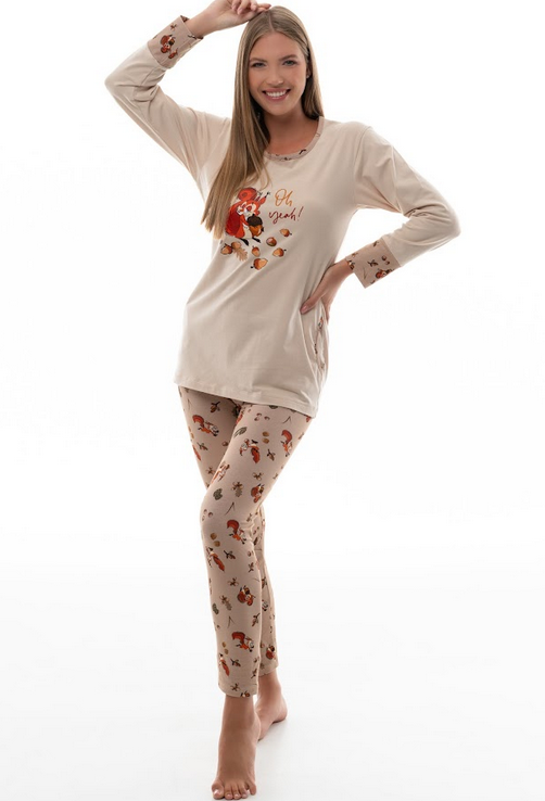 A hosszú szárú, mókus mintás leggings rugalmas pamut anyagból készült, amely puhán követi a mozgást, és egész éjszaka maximális komfortot biztosít.