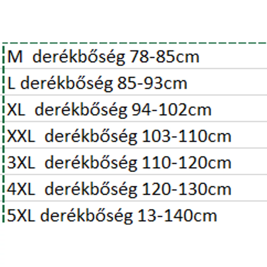 Gyártott méretek: S, M, L, XL, XXL, 3XL, 4XL, 5XL